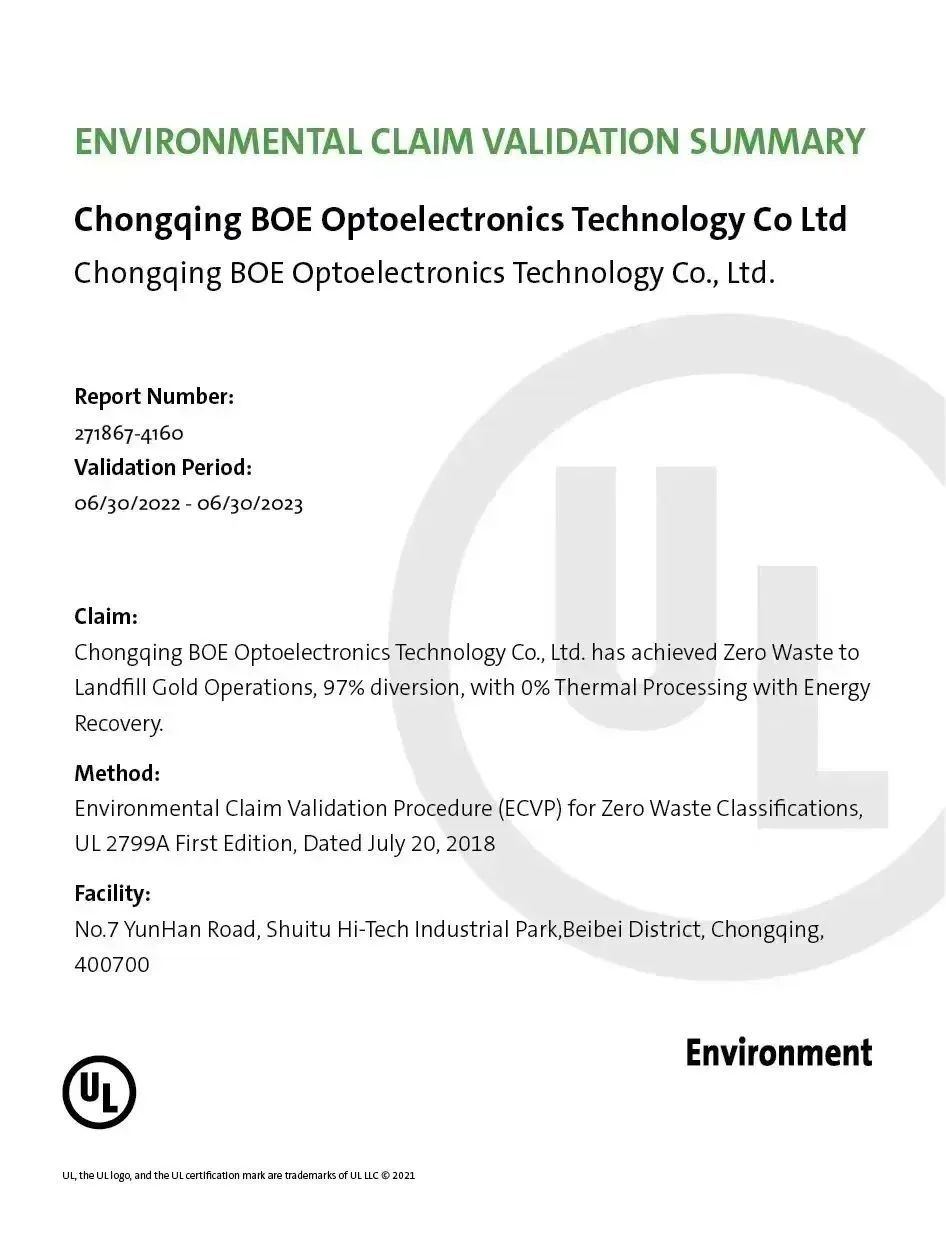 京東方通過(guò)在生產(chǎn)中應(yīng)用可再生材料和回收料,減少資源消耗,推動(dòng)上下游供應(yīng)鏈加入循環(huán)經(jīng)濟(jì)等行動(dòng)。其中,京東方重慶第8.5代TFT-LCD生產(chǎn)線在2022年獲得UL2799廢棄物零填埋金級(jí)認(rèn)證,且成為了中國(guó)大陸首家通過(guò)UL3600循環(huán)經(jīng)濟(jì)認(rèn)證的工廠。